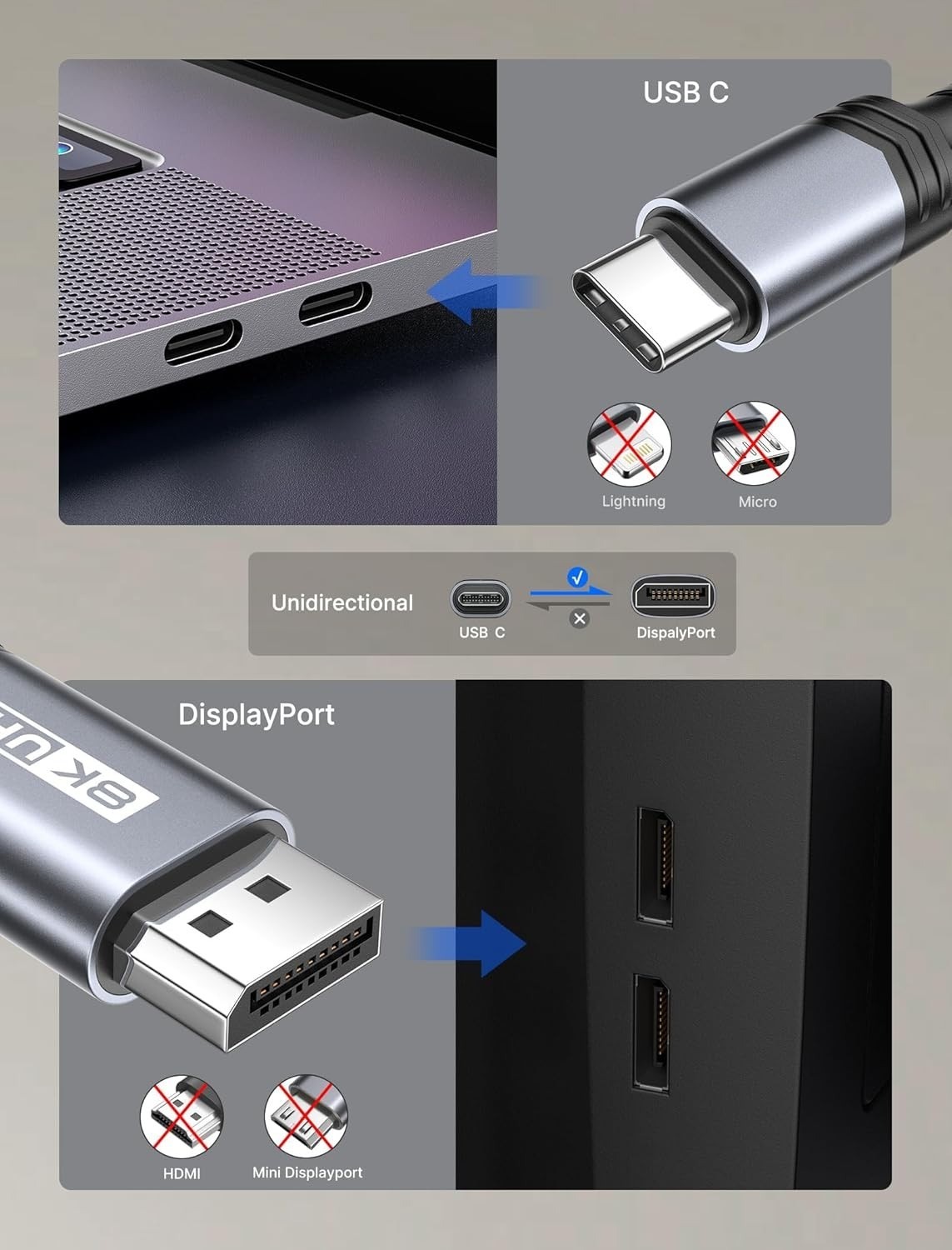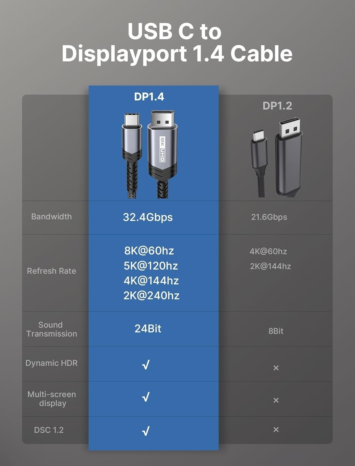 8K@60Hz--Excellent User Experience: USB C to Displayport 1.4 cable supports up to 8K@60Hz, 4K@144Hz, 2K@240Hz, 5K@120Hz resolution and refresh rate, llivers a crisp and detailed accentuated image. Please note: If you need 8K resolution, please make sure your computer and display support 8K.