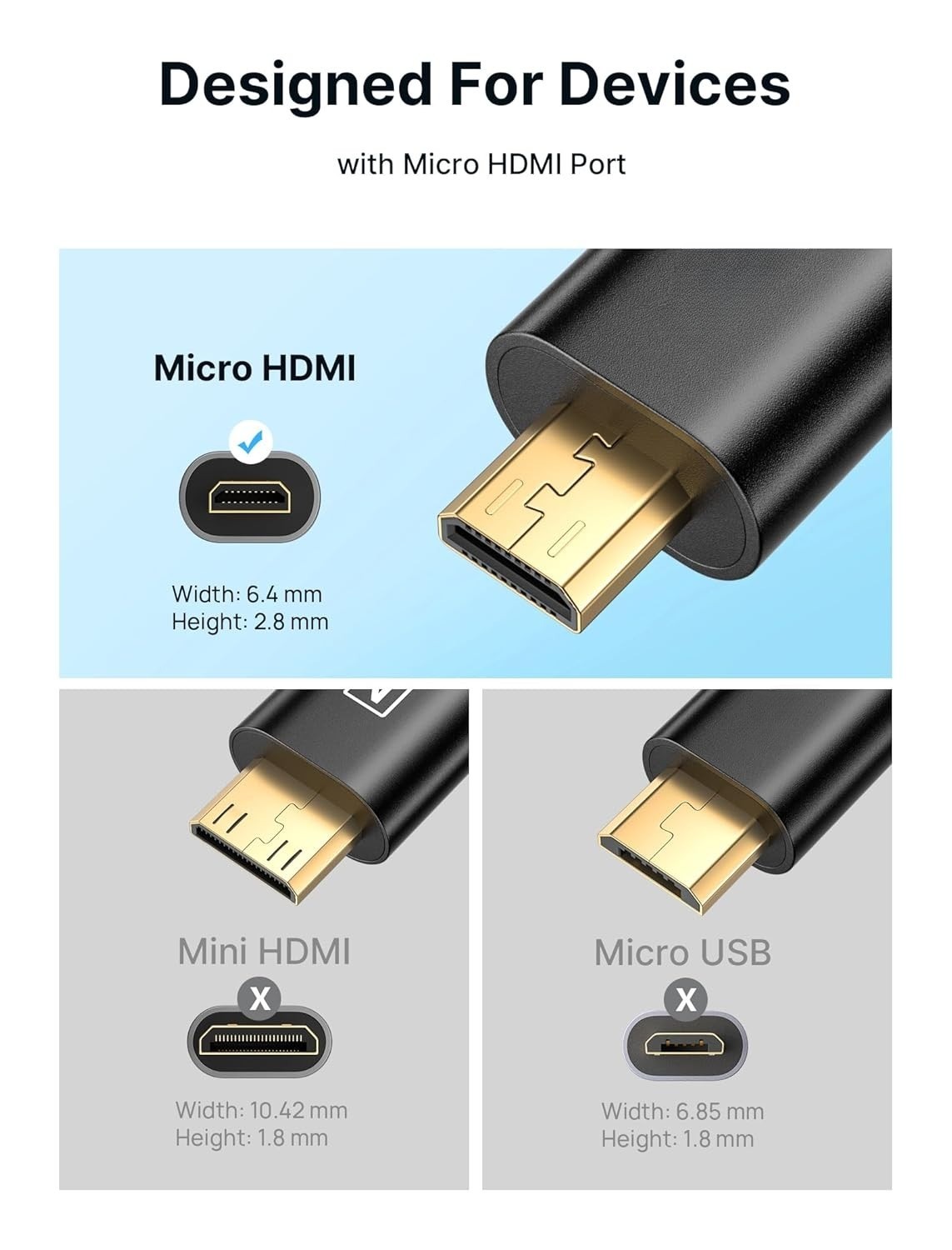 High Speed: This micro HDMI to HDMI adapter fully compliant with the latest HDMI standards, supports 18Gbps 4K@60Hz 4:4:4 HDR, backwards compatible to 4K@30Hz/2K@120Hz/1080P,with Dolby 3D Full HD capabilities, giving you a smooth and clear experience.★NOTE★ Please make sure your device has Micro HDMI port.