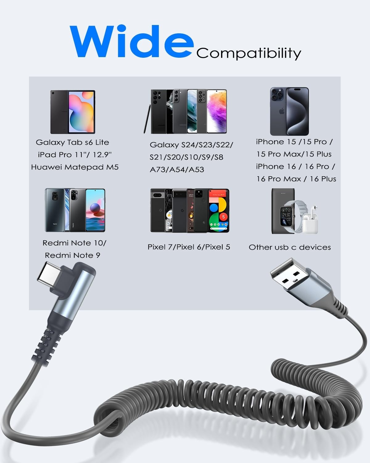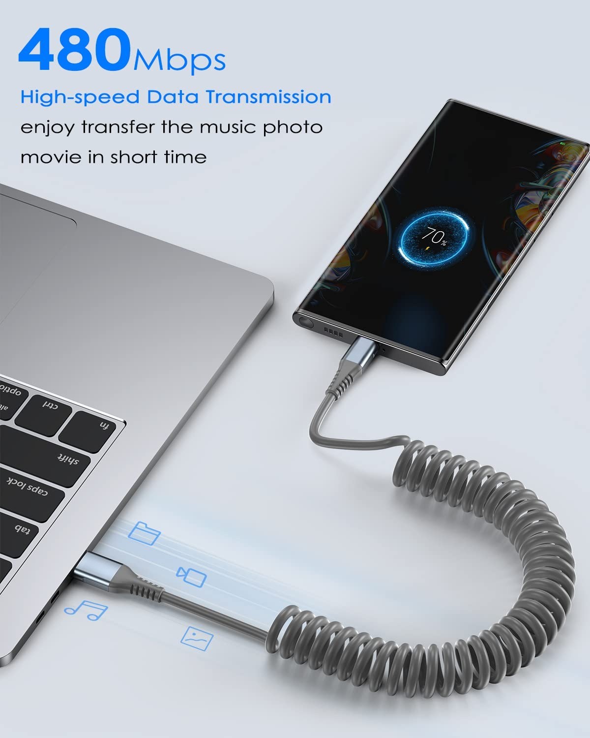 Elastic Coiled USB C Cable Made for Car: The USB Type-C cable is designed with stretchable, no tangle, no knot, and does not take up space. This coiled USB C charging cable is made of upgraded high quality PU material, which is flexible, easy to stretch, effortless, quick to rebound and not easily deformed.