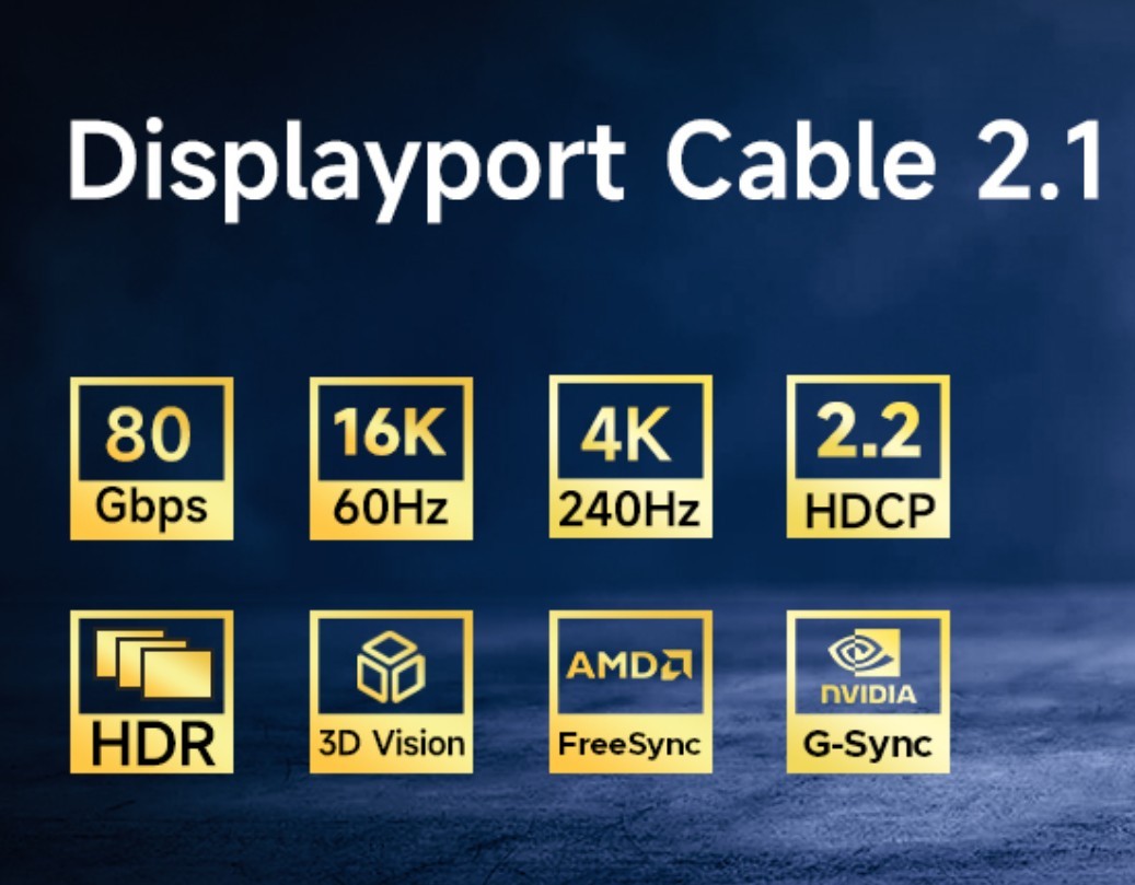 Displayport 2.1/2.0 backward compatible with DP1.4/DP1.2. It supports 16K@60Hz, 8K@120Hz, 4K@360Hz/240Hz/165Hz/144Hz, 2K@360Hz/240Hz/165Hz/144Hz, 80Gbps bandwith, HDR, 3D, DSC1.2a, HDCP2.2, FreeSync, G Sync, audio, which ensures high quality content transfer and lossless audio output, giving you a smooth using experience.