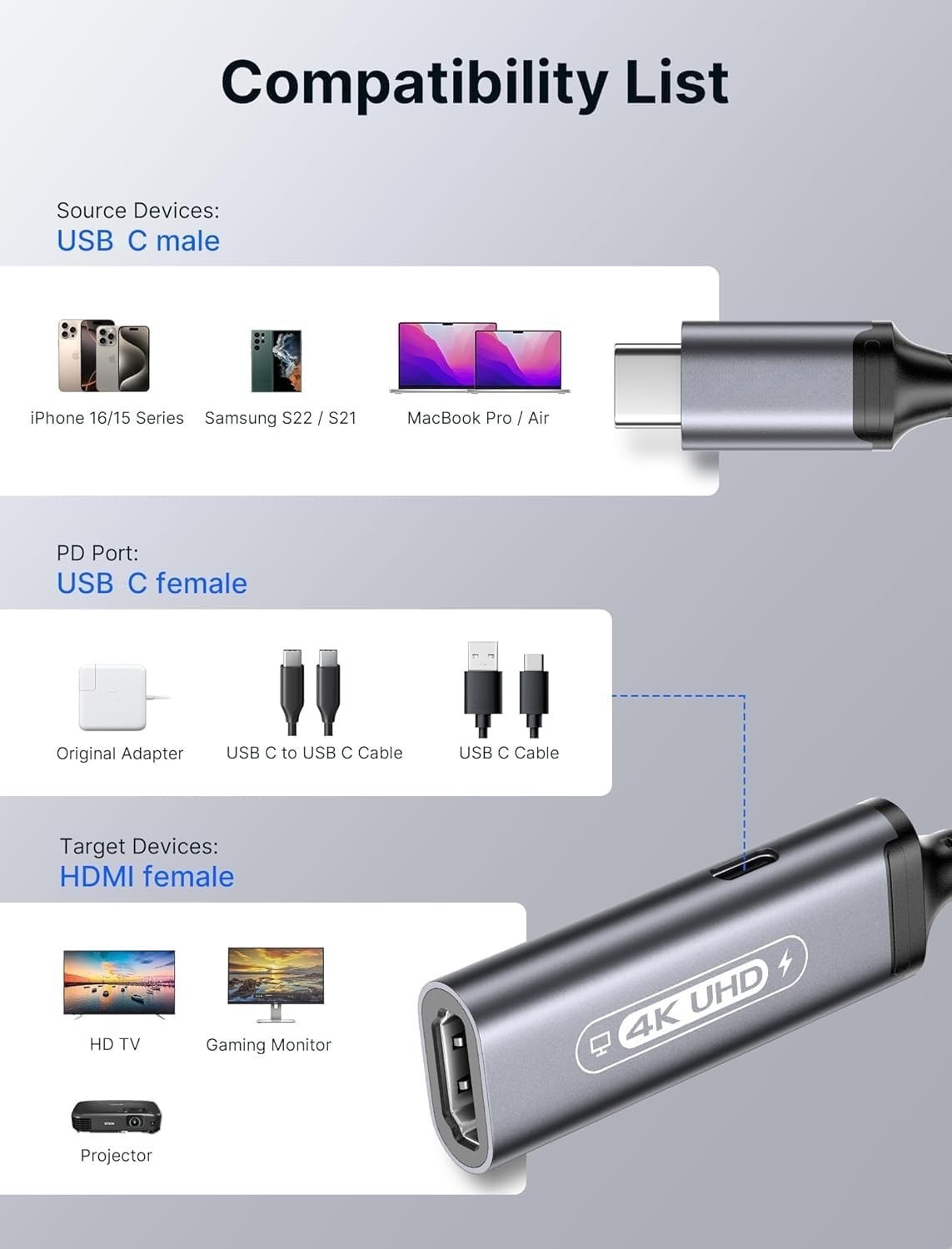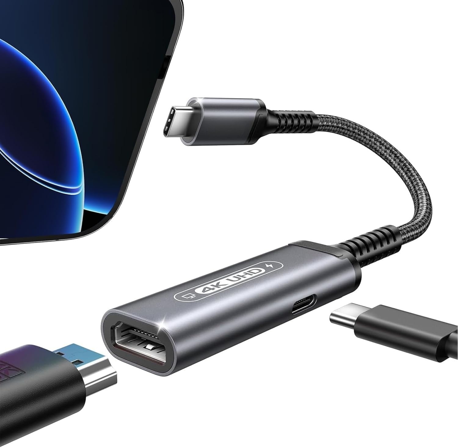 2-in-1 Type C to HDMI 4K@30Hz/100W Charging Compatible with iPhone 16 Pro/Pro Max/16/16 Plus/15 Pro Max,Samsung S24/S23,MacBook,Dell,Steam Deck,ROG Ally