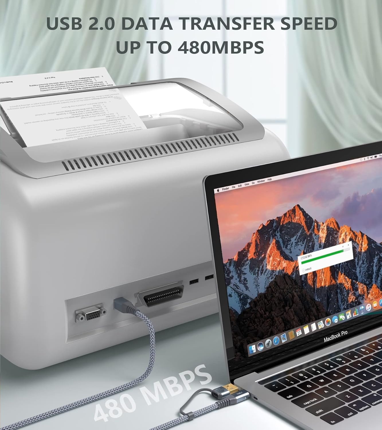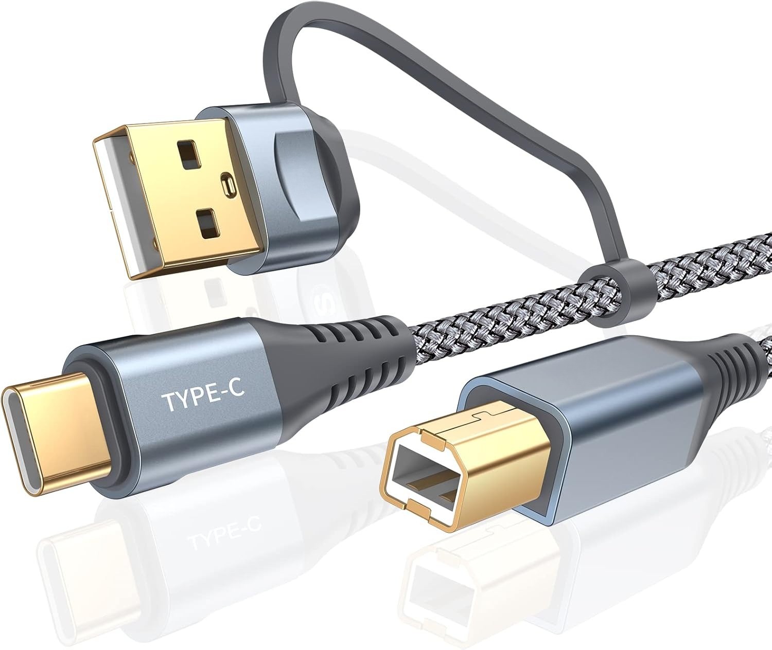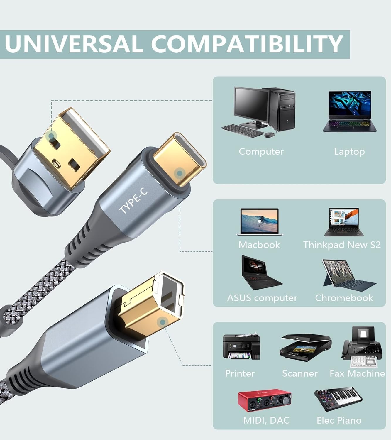 USB B to USB-C/A Cable 2-IN-1: This USB-B printer cord supports both USB-C & USB-A enabled devices (MacBook Pro/Air, Surface Book 2, Chromebook Pixel, Computer Desktop, Laptop etc.) to USB B 2.0 devices & peripherals (legacy printers, scanner, Yamaha Casio Digital Piano, USB MIDI-Controller, Electric Keyboard, etc.).