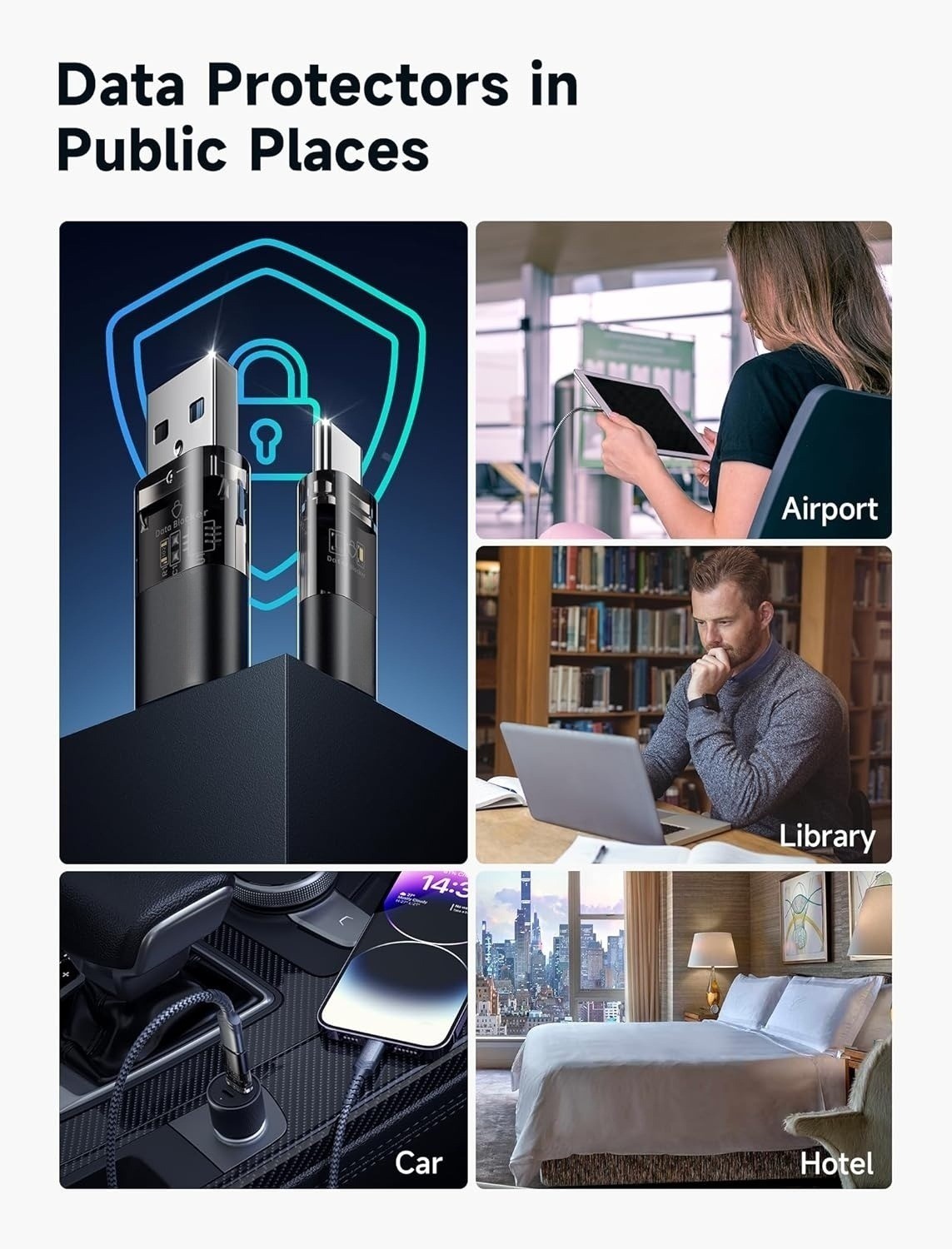 USB & USB C Data Blockers 4 Pack: We offer you two USB Data Blockers and two USB C Data Blockers, compatible with iPhone 16/16 Plus/16 Pro/16 Pro Max, iPhone 15/15 Plus/15 Pro/15 Pro Max, Samsung, iPad, Macbook and other devices. Whether you are using standard USB or USB C ports, you can meet the safe charging needs.