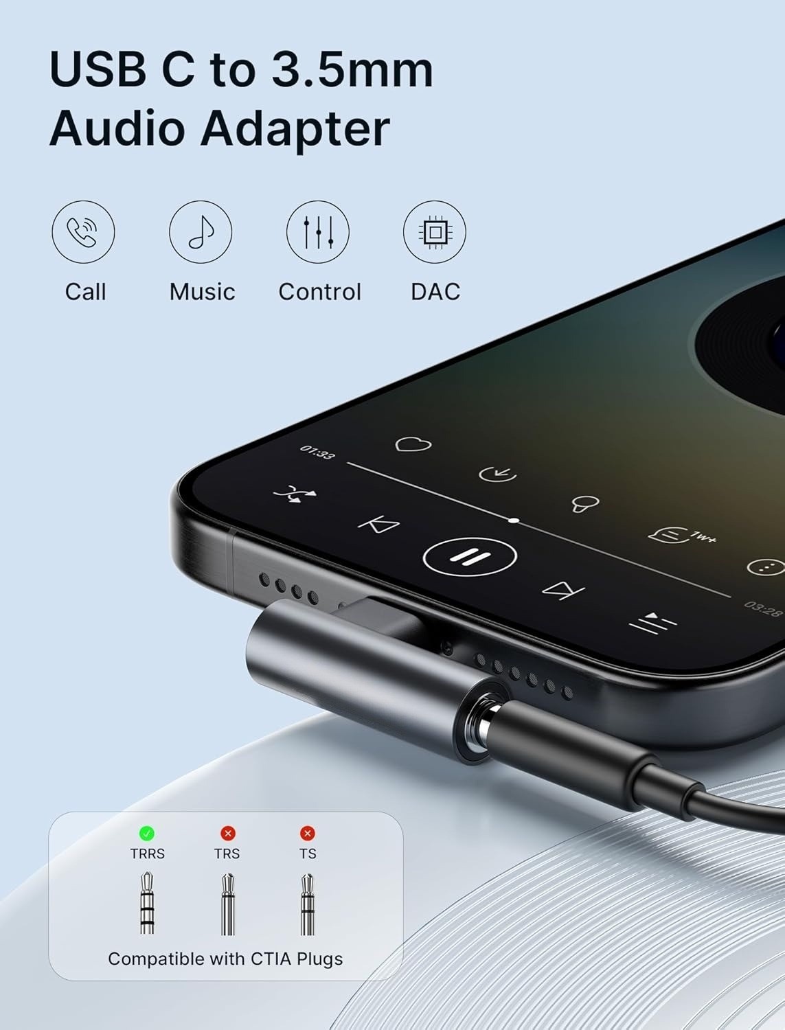 Multi-function Use and Easy Carry:Call, volume control, pause via function keys on the headphones are possible. Type c to 3.5mm jack features ultra-mini and lightweight size, it's very convenient for you to outdoor running and traveling.