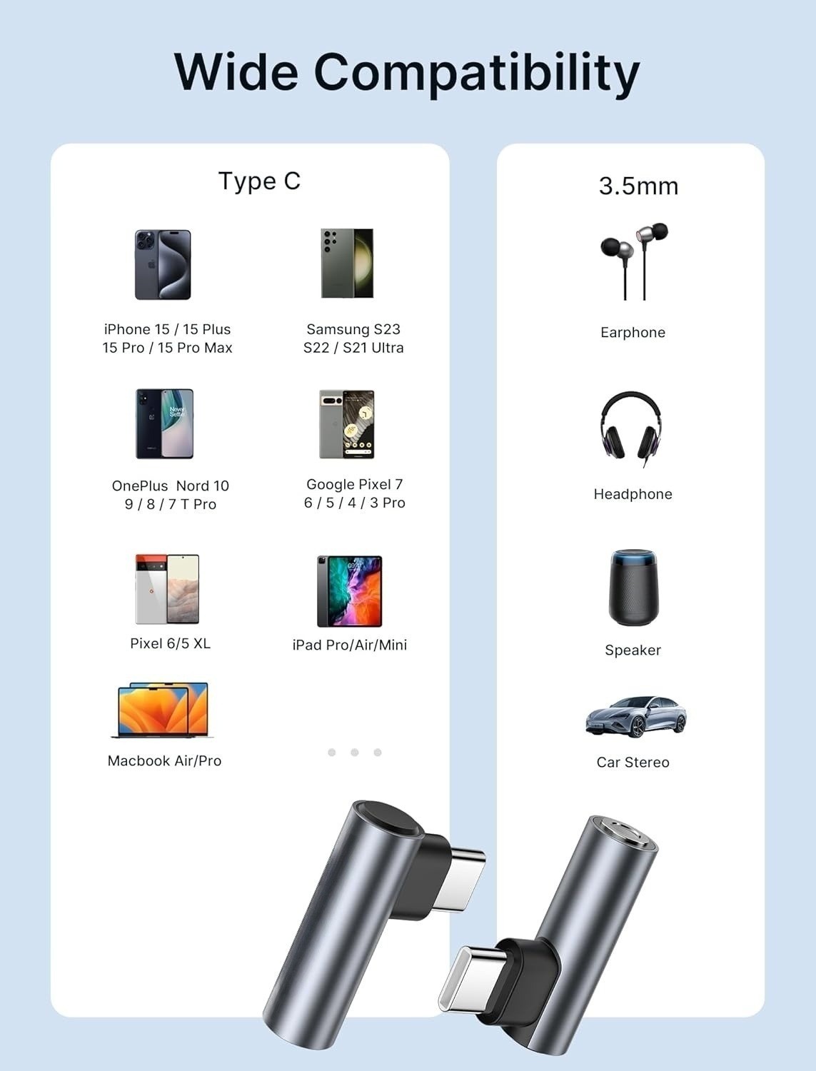 Compatibility List:The usb c to aux adapter compatible with most of the type c devices: iPhone 14 15 16 Pro Max Plus, Samsung Galaxy S24 S23 S23+ S23 Ultra,S22 S22+ S22 Ultra, S21 S21+ S21 Ultra, S20 S20+ S20 Ultra, Note10 A8 A80, iPad pro 2021, iPad mini 6, Macbook, pixel , Huawei Mate 30 20 10 Pro, P30 P20 and more.