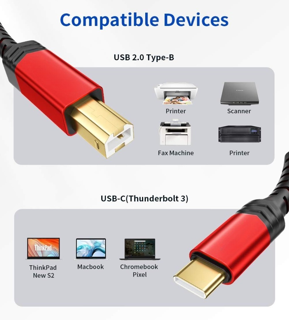 Compatibility:The usb b to usb c cable is working for Type-C Devices and Laptops, compatible with MacBook Pro, Google Chromebook Pixel, HP Canon Printers, 2018/2017 MacBook Pro, MacBook Air,Brother, Canon, Dell, Epson, Fujitsu, HP and more.