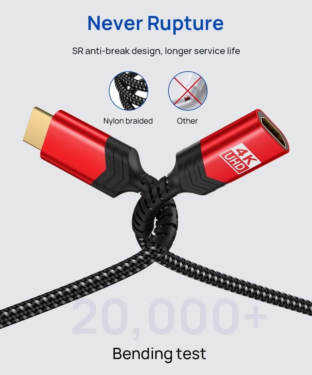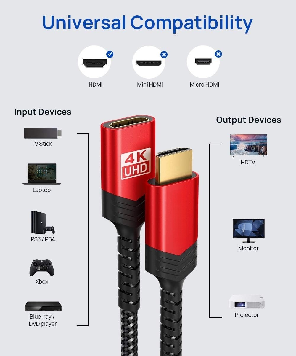Widely Compatibility: HDMI male to female extender can extend the connection between UHD TV, HDTV, monitor, projector or other display and HDMI source devices such as TV stick, DVD/Blu-ray players, PS4/PS3, computers, etc.