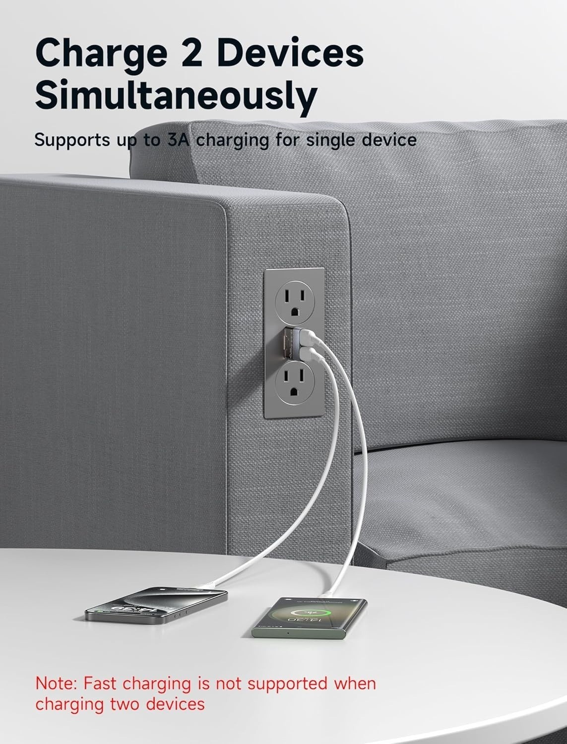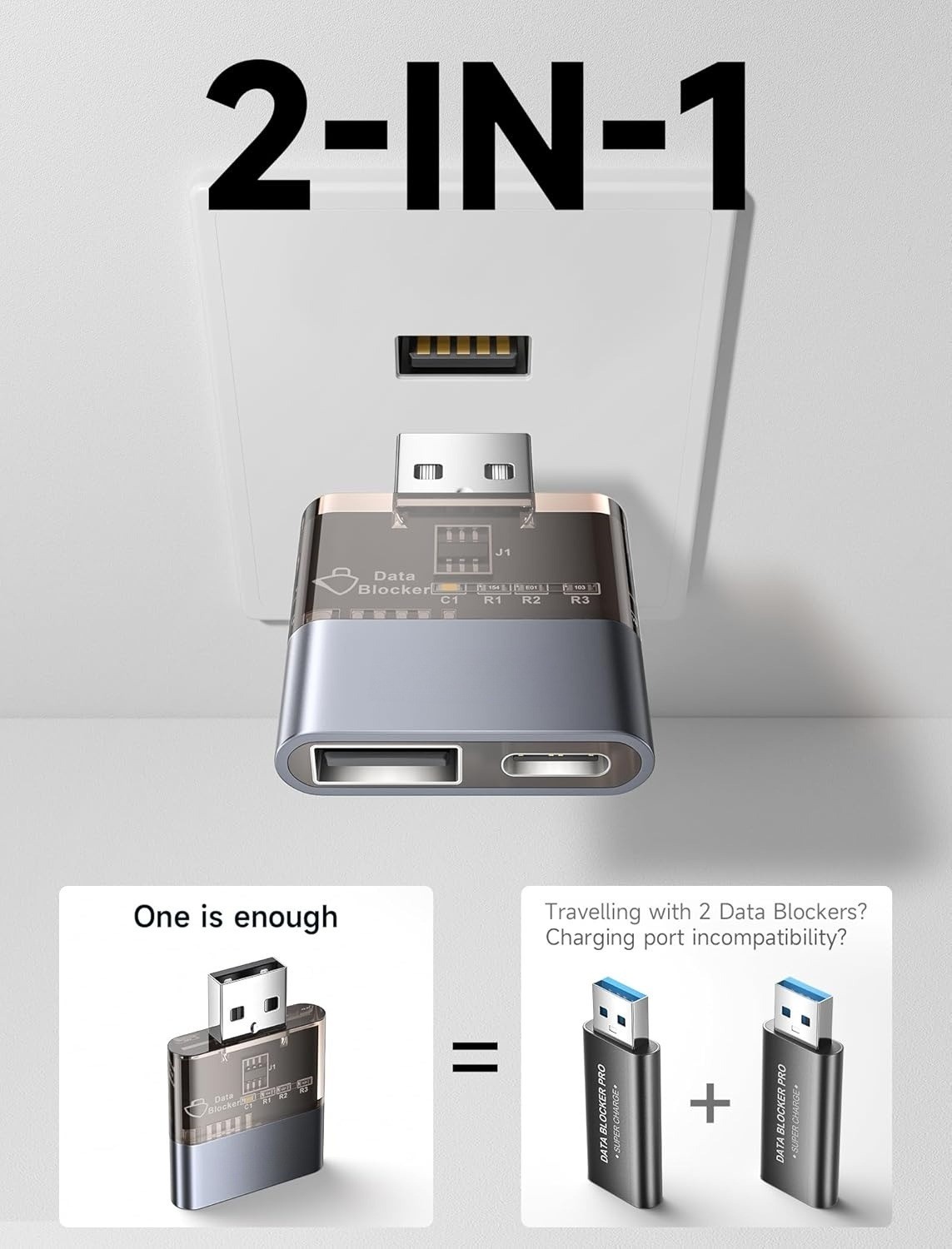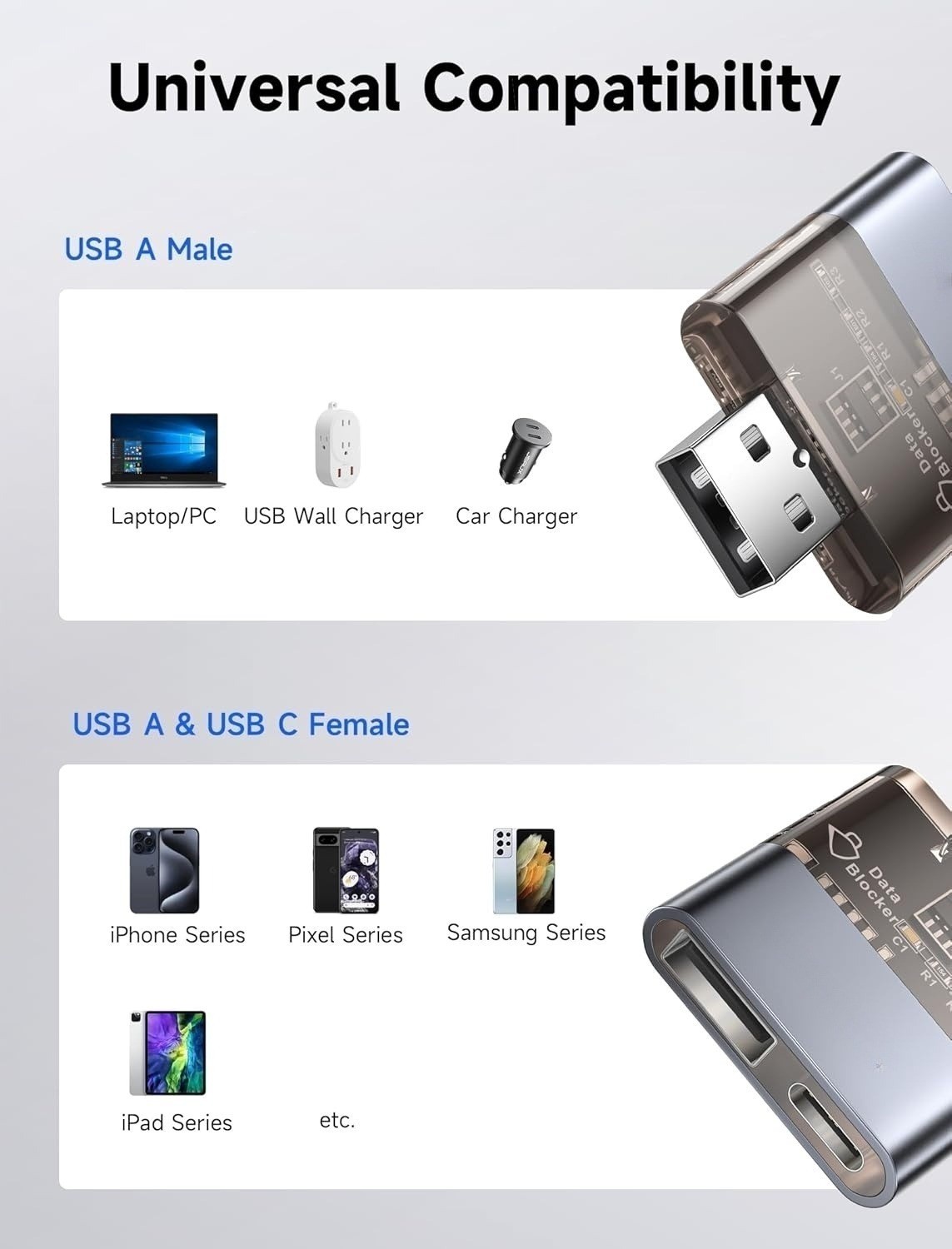 2-in-1 Data Blocker: We have combined the USB A to USB C and USB A to USB A data blocker into one, just one can meet the convenience of charging two devices at the same time. No need to worry about finding the right charging port. Supports up to 3A charging for a single device. Note: Fast charging is not supported when charging two devices at the same time.