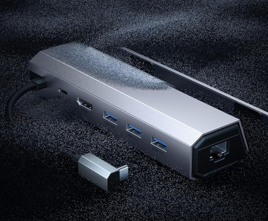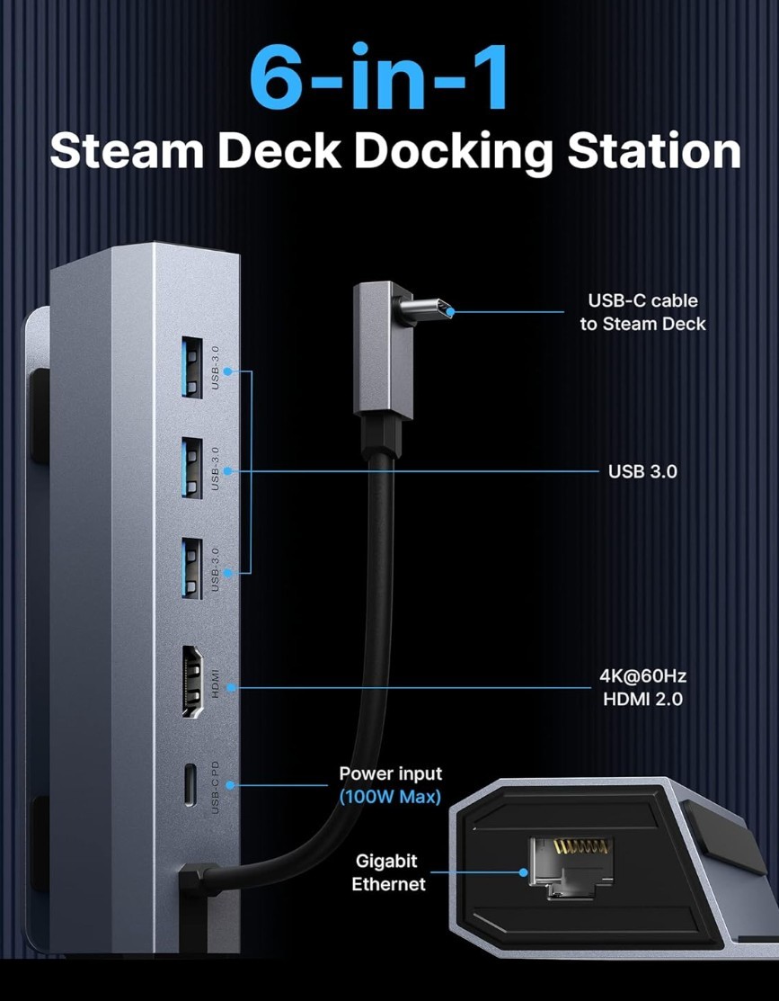 Boost your gaming with our 6-in-1 dock, featuring 4K@60Hz HDMI, Gigabit Ethernet, three USB 3.0 ports, and a USB C port for 100W charging.